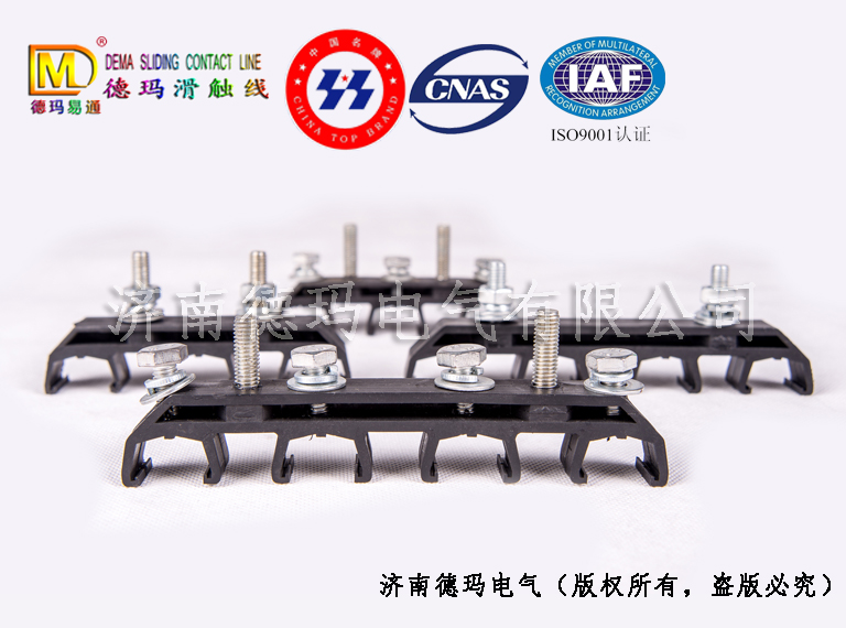 三孔或四孔提掛架又稱(chēng)懸掛架用來(lái)懸掛輕型滑觸線(xiàn),每1.5米一個(gè)。提掛架用螺栓與固定在行車(chē)軌道上(或墻上)的角鋼支架連接在一起,從而把滑觸線(xiàn)懸掛起來(lái)。其材料為聚甲荃,具有高硬度、抗腐蝕、抗老化的特性,其既能支撐懸掛滑導(dǎo)線(xiàn),又能在水平、垂直方向固定滑導(dǎo)線(xiàn)。同時(shí)垂直方向可微調(diào),保證滑導(dǎo)線(xiàn)與集電器的緊密聯(lián)結(jié)。提掛夾固定滑導(dǎo)線(xiàn)時(shí)只需與護(hù)套兩邊的吊耳扣合就能輕易地完成安裝,不需任何工具,安裝十分便捷。